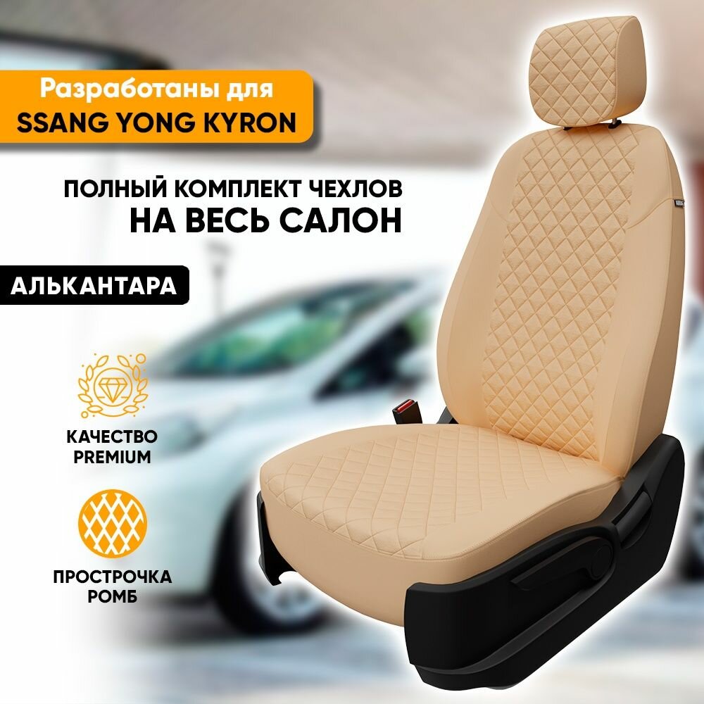 Купить Чехлы для автомобильных сидений Ssang Yong Kyron / СаньЕнг Кайрон (2005-2016) из алькантары «Ромб», цвет бежевый, задняя спинка раздельная 40/60 (комплект авточехлов на весь салон) с доставкой по всей России.