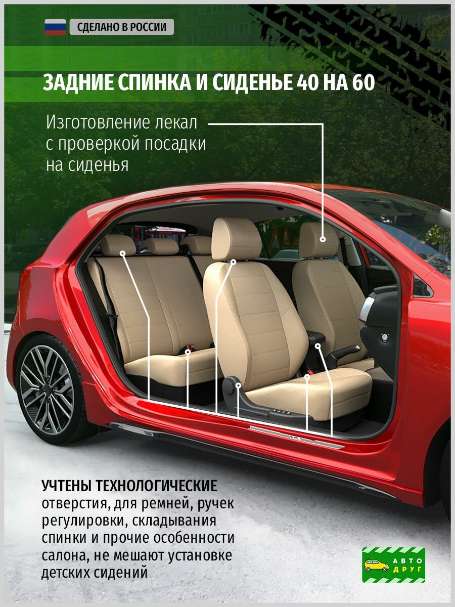 Центральная часть чехлов изготовлена из экокожи с перфорацией бежевого цвета с перфорацией, что позволяет чехлам дышать