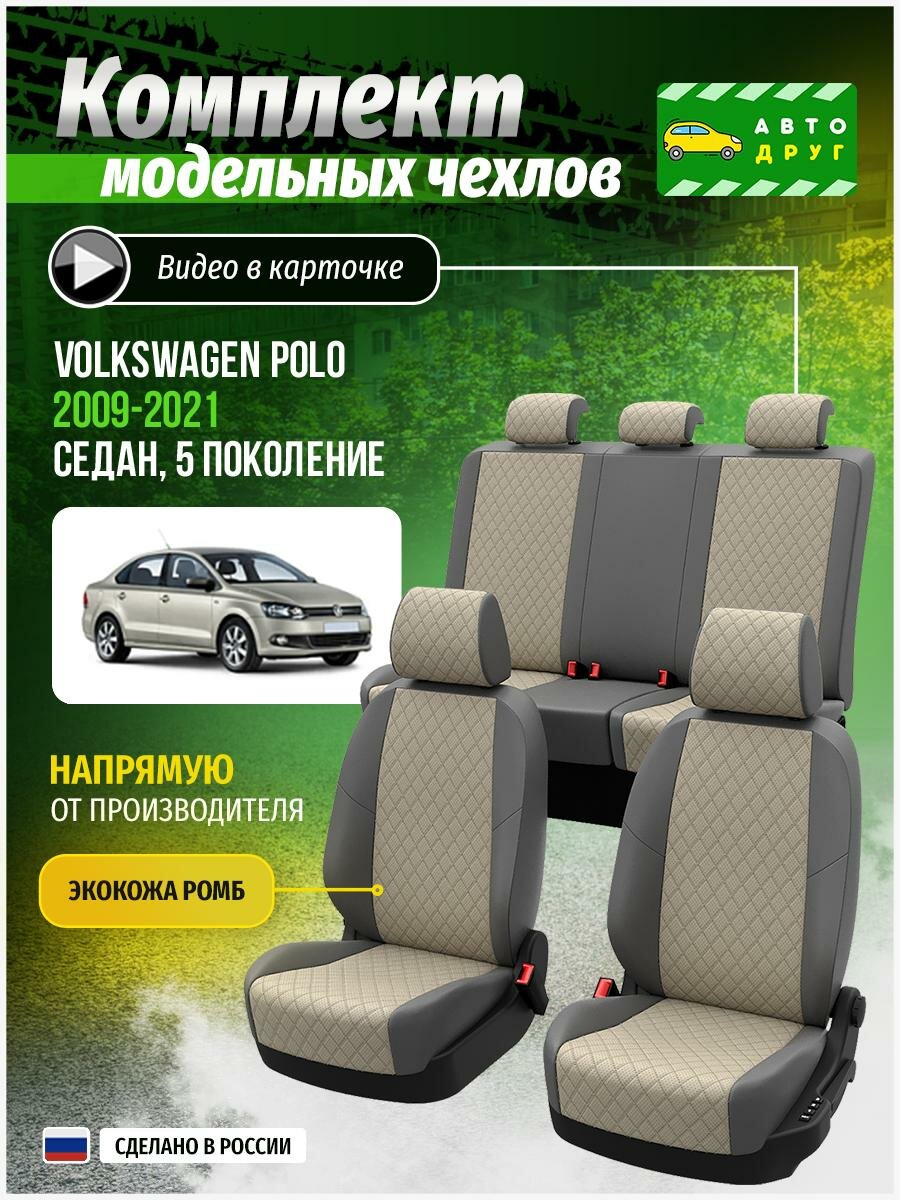Данный комплект чехлов предназначен для салона со следующими особенностями: Чехлы для Volkswagen Polo. Задние спинка и сиденье формата 40 на 60. Есть передний подлокотник, 5 подголовников. С 2010-2020г, седан.