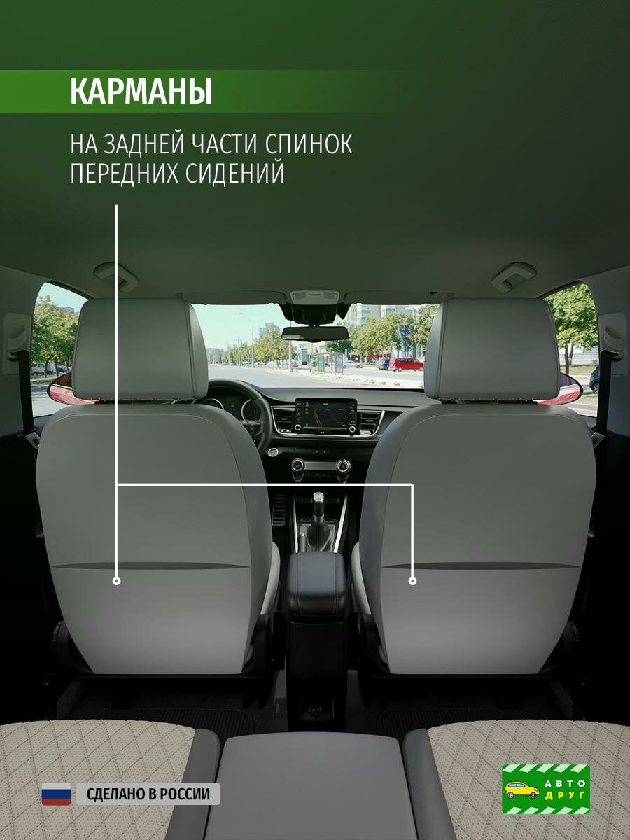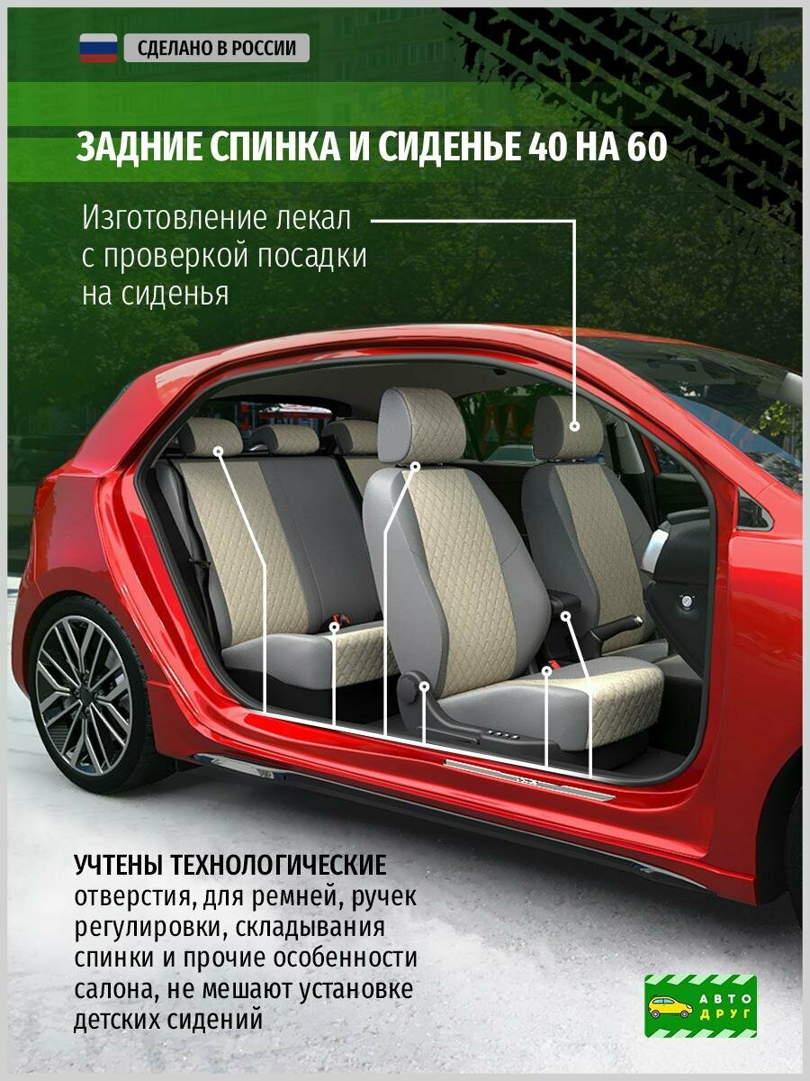 Центральная часть чехлов изготовлена из экокожи с ромбом и перфорацией красного цвета с перфорацией, что позволяет чехлам дышать