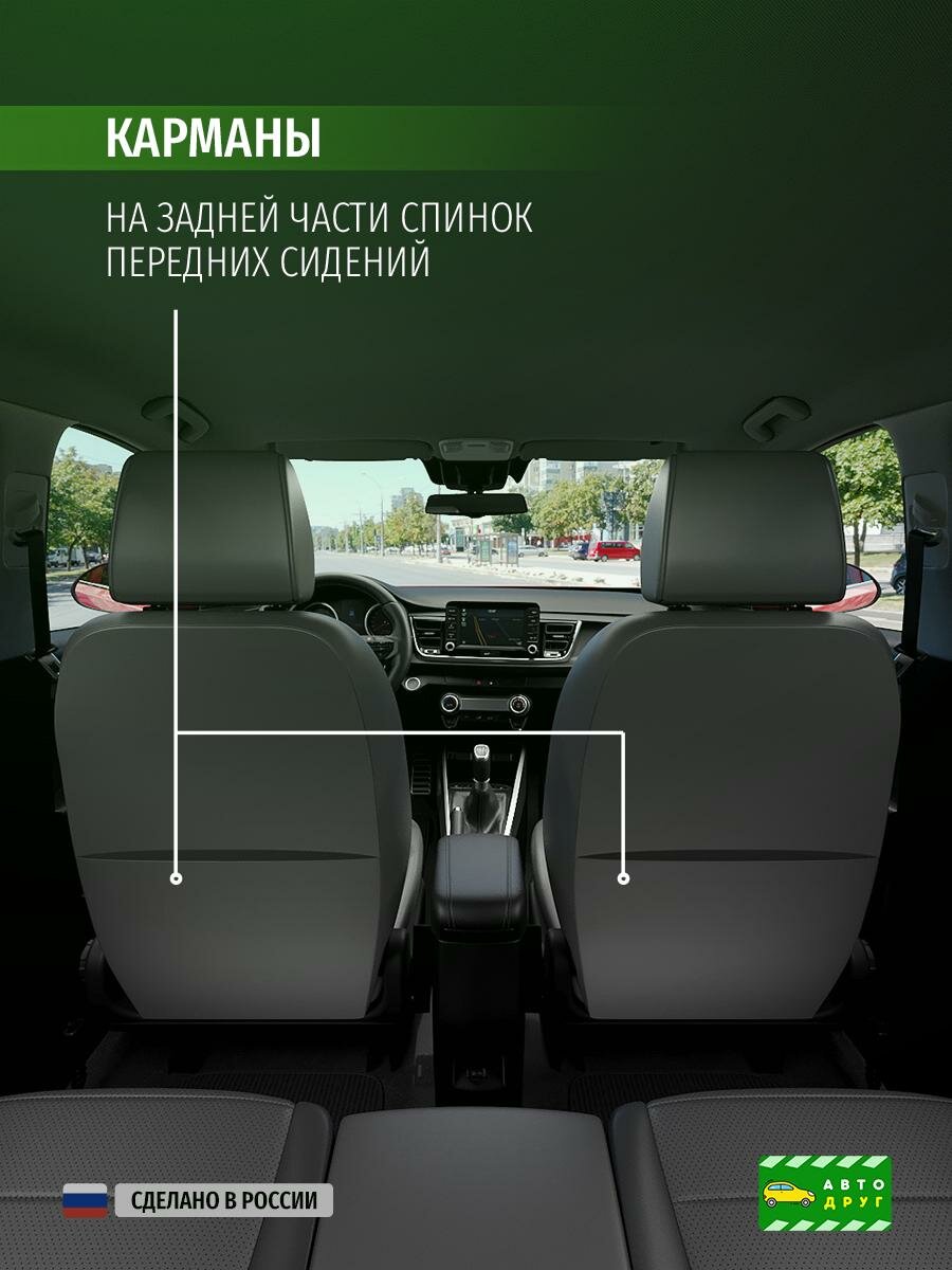 Центральная часть чехлов изготовлена из экокожи с перфорацией темно-серого цвета с перфорацией, что позволяет чехлам дышать