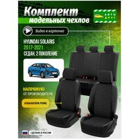 Данный комплект чехлов предназначен для салона со следующими особенностями: Чехлы автомобильные для Hyundai Solaris с 2017-н. в, седан, хэтчбек. Задние спинка и сиденье единые. Имеется 2 передних подголовника. Задние чехлы в форме "горба".
