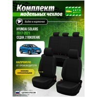 Данный комплект чехлов предназначен для салона со следующими особенностями: Чехлы автомобильные для Hyundai Solaris с 2017-н. в, седан, хэтчбек. Задние спинка и сиденье единые. Имеется 2 передних подголовника. Задние чехлы в форме "горба".