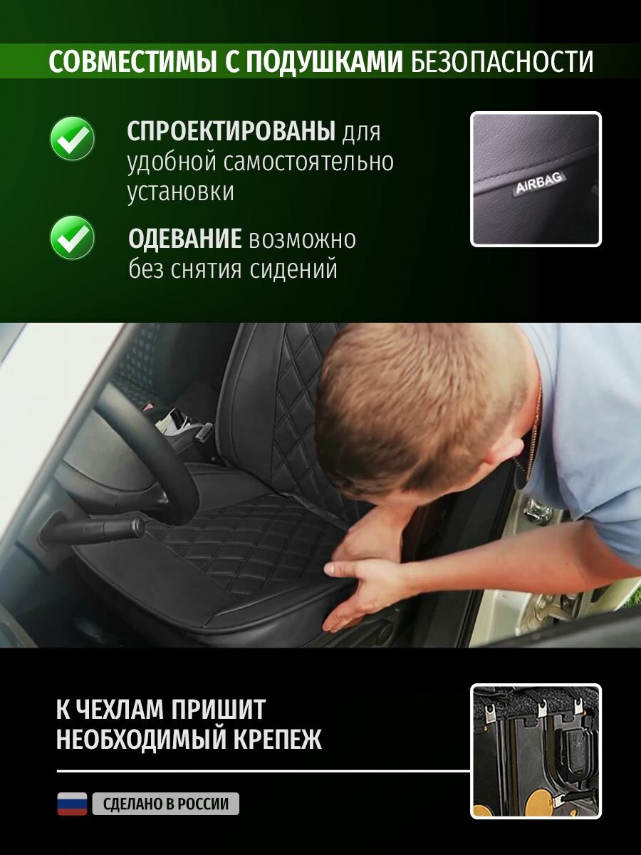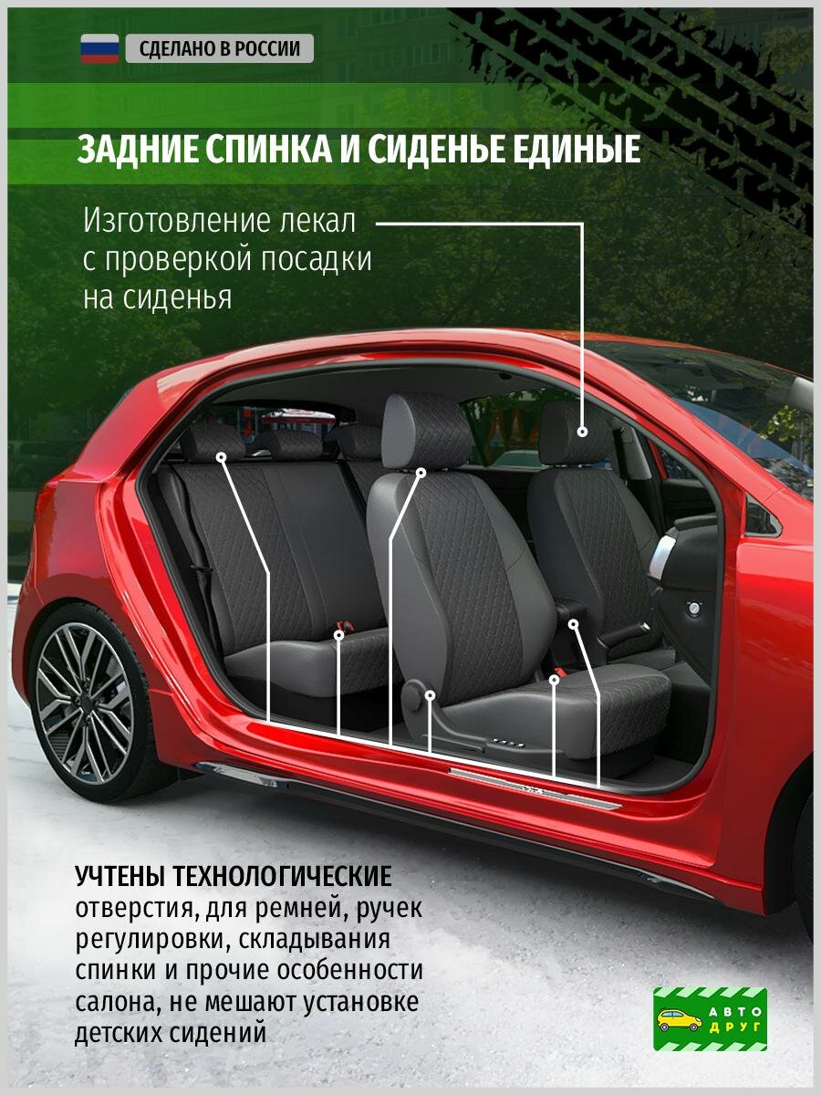 Центральная часть чехлов изготовлена из экокожи с ромбом и перфорацией темно-серого цвета с перфорацией, что позволяет чехлам дышать