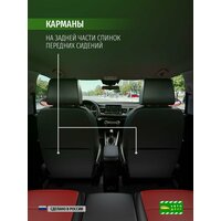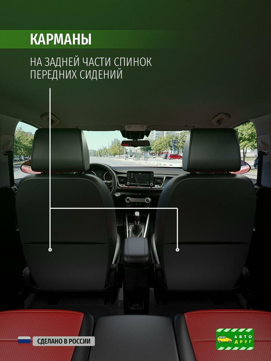 Центральная часть чехлов изготовлена из экокожи с перфорацией красного цвета с перфорацией, что позволяет чехлам дышать