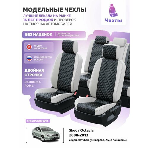 Купить Чехлы для Skoda Octavia A5 2 2008-2013 Чехлы. ру Экокожа с ромбом Белый Черный 2 строчки 5679AV169FT2 с доставкой по всей России.