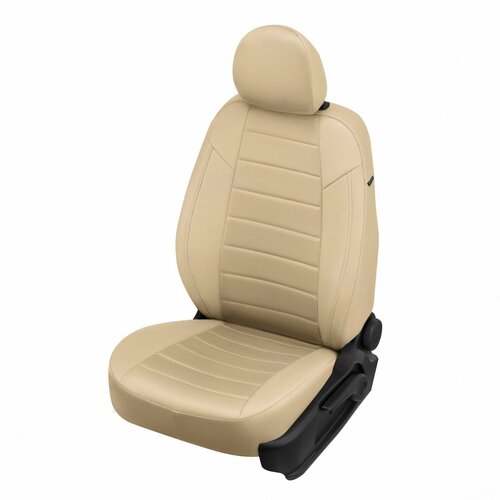 Авточехлы из экокожи Аригон со вставкой из алькантары по центру сидений в классическом дизайне с полосами для автомобиля на Ford Focus 3 седан, хэтчбек, универсал Sport/Titanium 2011, 2012, 2013, 2014, 2015, 2016, 2017, 2018, 2019 года выпуска цвет бежевый.