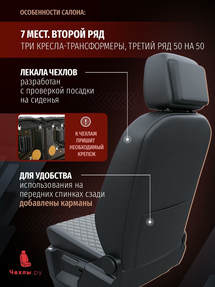 При пошиве чехлов Форд Галакси 2 2006-2015 7 мест. Второй ряд три кресла-трансформеры, третий ряд 50 на 50 учтены особенности комплектации, используются только качественные материалы и прочные нити. Все края прошиты, швы обработаны специальным составом для максимальной защиты от загрязнений. Материал Экокожа с ромбом безопасен в применении, не вызывает раздражений и аллергии, не красит одежду. Для очистки чехлов «модель» можно использовать влажную ткань или салфетки.