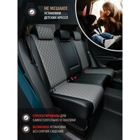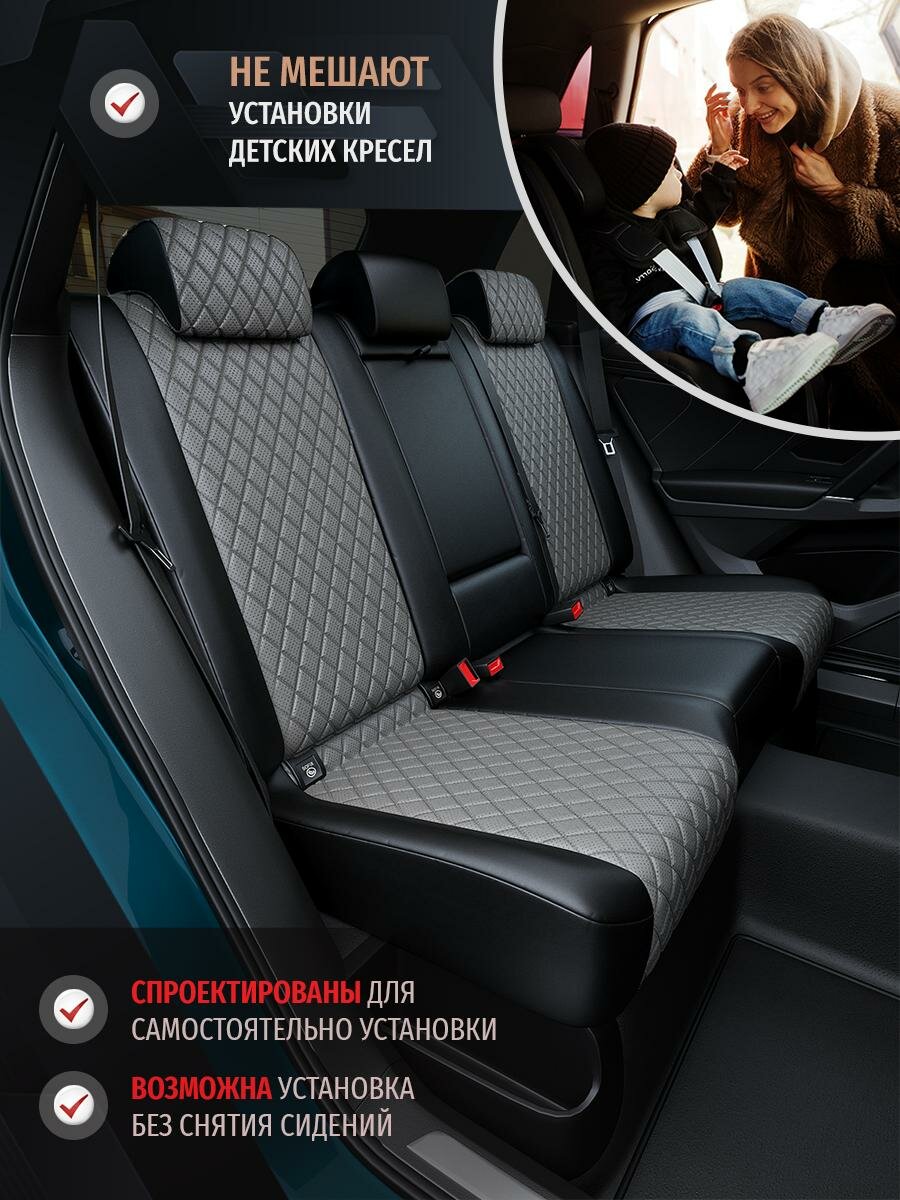 Центральная вставка Авточехлов, изготовленные из материала Экокожа с ромбом, цвет Светло-Серый, а боковые вставки и спинка из материала Экокожа цвет Черный, придадут салону вашего автомобиля изысканность и помогут создать в нем комфортную атмосферу.