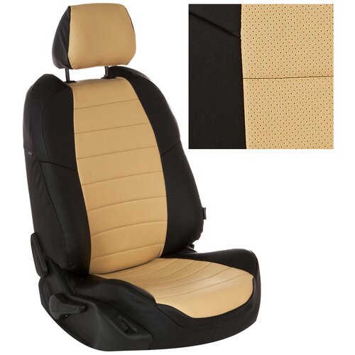Это модельные чехлы на Hyundai ix-35 2010, 2011, 2012, 2013, 2014, 2015 года выпуска цвет черный с бежевым, выполненные в классическом дизайне с горизонтальными полосами по центру сидений.