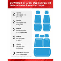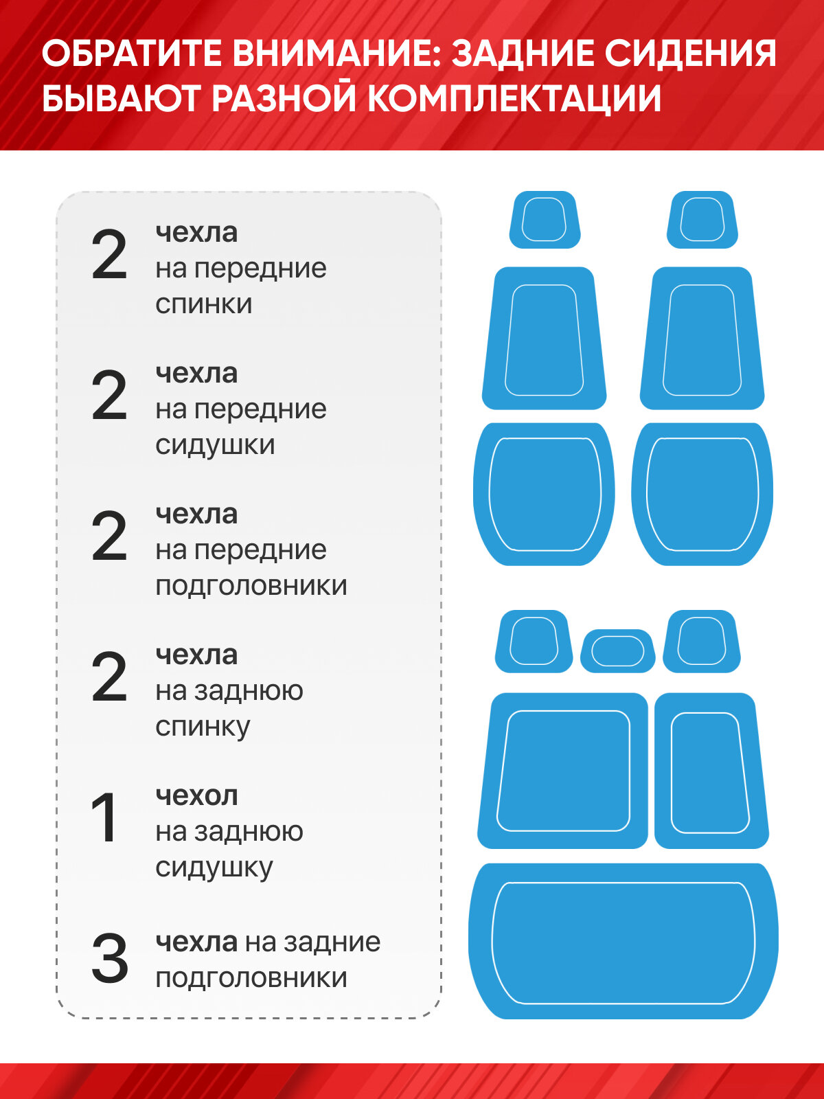 2 чехла на передние спинки, 2 чехла на передние подушки,; 2 чехла на передние подголовники, 2 чехла на задние спинки, 1 чехол на заднюю сидушку, крепежи и инструкция по установке; чехлы на задние подголовники 2плюс1