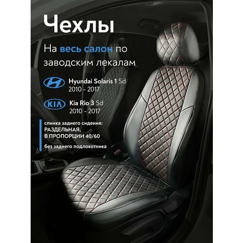 Чехлы на сидения для Хендай Солярис 1(Hyundai Solaris I) / Киа Рио 3 (Kia Rio 3) хетчбэк 2010-2017 г. в. (спинка заднего сидения 40/60, без подлокотника) из Экокожи Ромб, черные с красной строчкой: сравнение цен, характеристики, фото, актуальное наличие и цены.