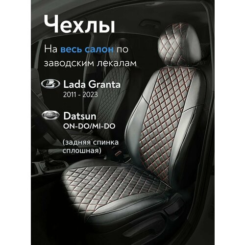 Чехлы на сидения для Лада Гранта (Lada Granta) / Датсун он-до (Datsun ON-DO)/ ми-до (MI-DO) с 2011 г. в. (спинка заднего сидения сплошная, без подлокотника), из экокожи, Ромб, черные с красной строчкой: сравнение цен, характеристики, фото, актуальное наличие и цены.