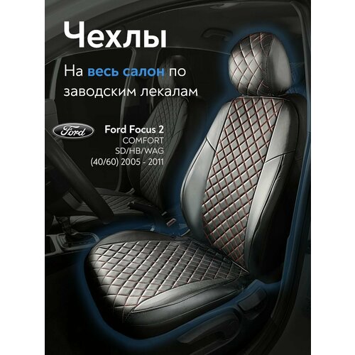 Чехлы на сидения Форд Фокус 2 Комфорт (Ford Focus 2 Comfort) с 2005-2011 г. в, (без подлокотника, спинка заднего сидения раздельная 40/60) из Экокожи Ромб, черные с красной строчкой: сравнение цен, характеристики, фото, актуальное наличие и цены.