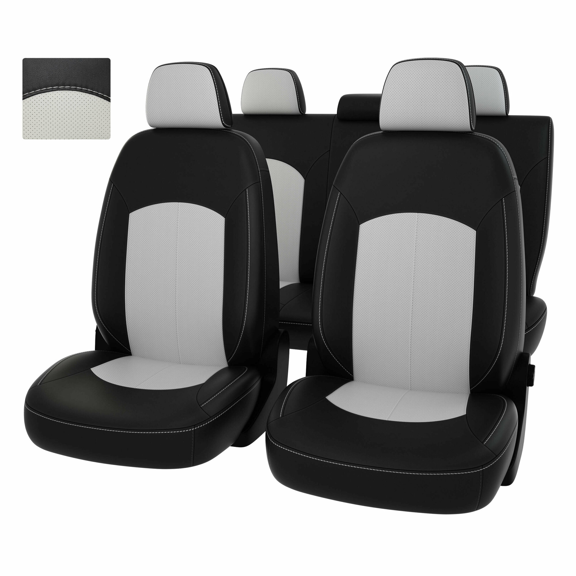 Комплект чехлов состоит из 16 изделий. Cпинки передние - 2, сиденья передние - 2, спинка задняя большая - 1, спинка задняя малая - 1, сиденье заднее большое - 1, сиденье заднее малое - 1, подголовники передние - 2, подголовники задние – 5, передний подлокотник - 1.