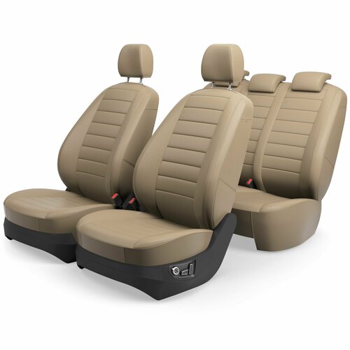 Материал центральной части - износостойкая Экокожа с перфорацией. , толщина 1.2 мм. Цвет - бежевый + подкладка 6 мм, из вспененного пенополиуретана для дополнительного комфорта и модельной посадки на сиденье. Материал боковой части - Бежевая Экокожа + 3 мм. вспененного пенополиуретана для 3D эффекта.