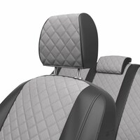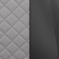 Материал центральной части - износостойкая Экокожа Ромб-Квадрат с перфорацией. , толщина 1.2 мм. Цвет - Серый + подкладка 6 мм, из вспененного пенополиуретана для дополнительного комфорта и модельной посадки на сиденье. Материал боковой части - Черная Экокожа + 3 мм. вспененного пенополиуретана для 3D эффекта.