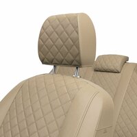 Материал центральной части - износостойкая Экокожа Ромб-Квадрат с перфорацией. , толщина 1.2 мм. Цвет - бежевый + подкладка 6 мм, из вспененного пенополиуретана для дополнительного комфорта и модельной посадки на сиденье. Материал боковой части - Бежевая Экокожа + 3 мм. вспененного пенополиуретана для 3D эффекта.