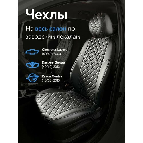 Купить Чехлы на сиденья Шевроле Лачетти (Chevrolet Lacetti) с 2004/ Дэу Джентра (Daewoo Gentra)с 2013/ Равон (Ravon Gentra)с 2015,(спинка заднего сидения 40/60), из экокожи, Ромб, черные с доставкой по всей России.