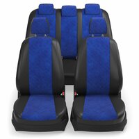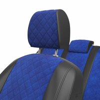 Материал центральной части - износостойкая Алькантара Ромб-Квадрат Цвет - синий + подкладка 6 мм, из вспененного пенополиуретана для дополнительного комфорта и модельной посадки на сиденье. Материал боковой части - Черная Экокожа + 3 мм. вспененного пенополиуретана для 3D эффекта.