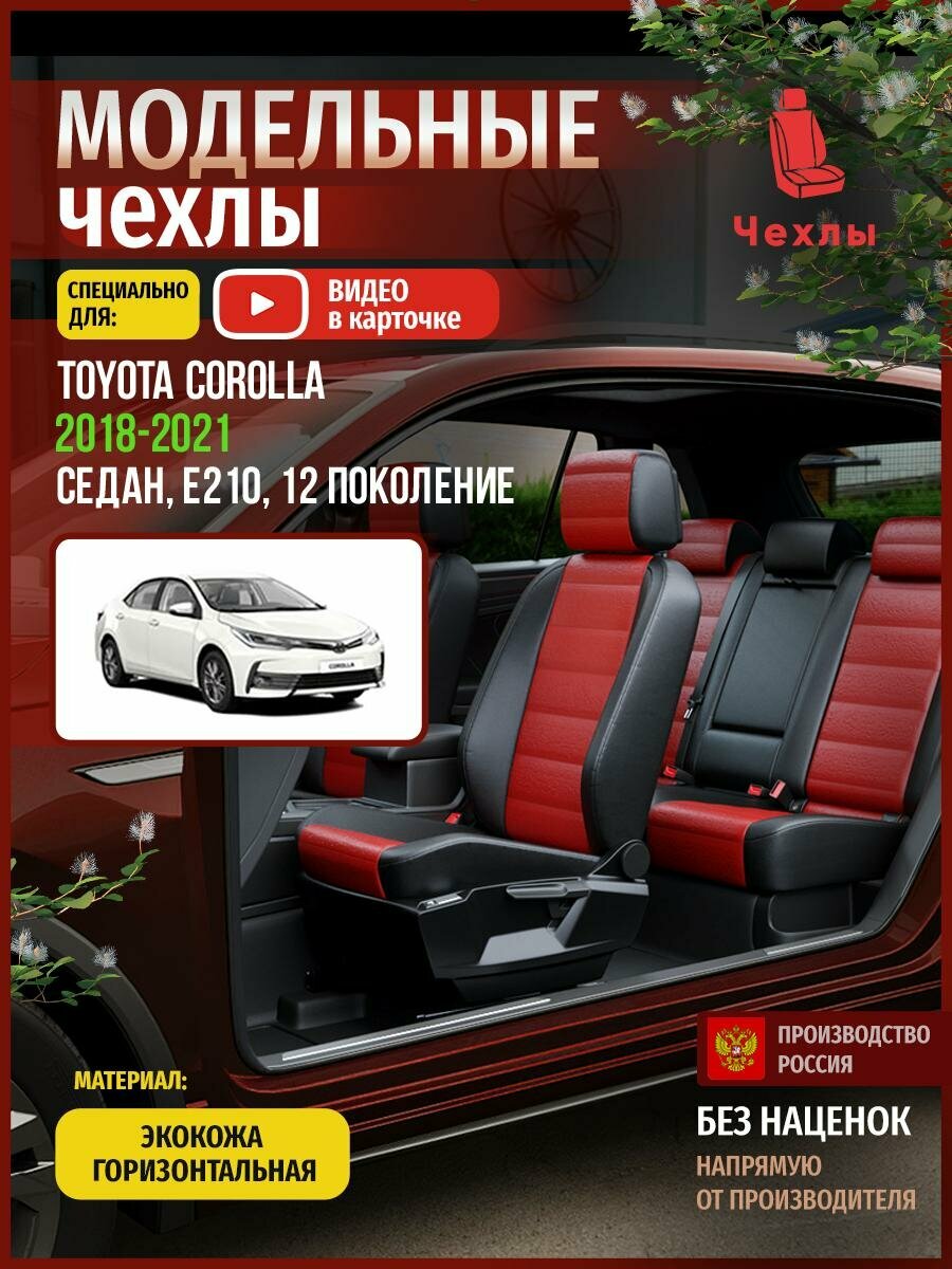 Модельные чехлы Тойота Королла 12 E210 2018-2021 Задняя спинка 40 на 60, сиденье единое. Передний + задний подлокотники, 4 подголовника + 1 задний, средний литой спроектированы и сшиты специально для данной марки автомобиля. Учтены все конструктивные особенности салона: форма подлокотников и подголовников, габариты боковой поддержки кресел, расположение ремней, подушек безопасности и прочие швы для технических отверстий. Индивидуальный пошив обеспечивает максимальную точность подгонки.