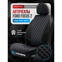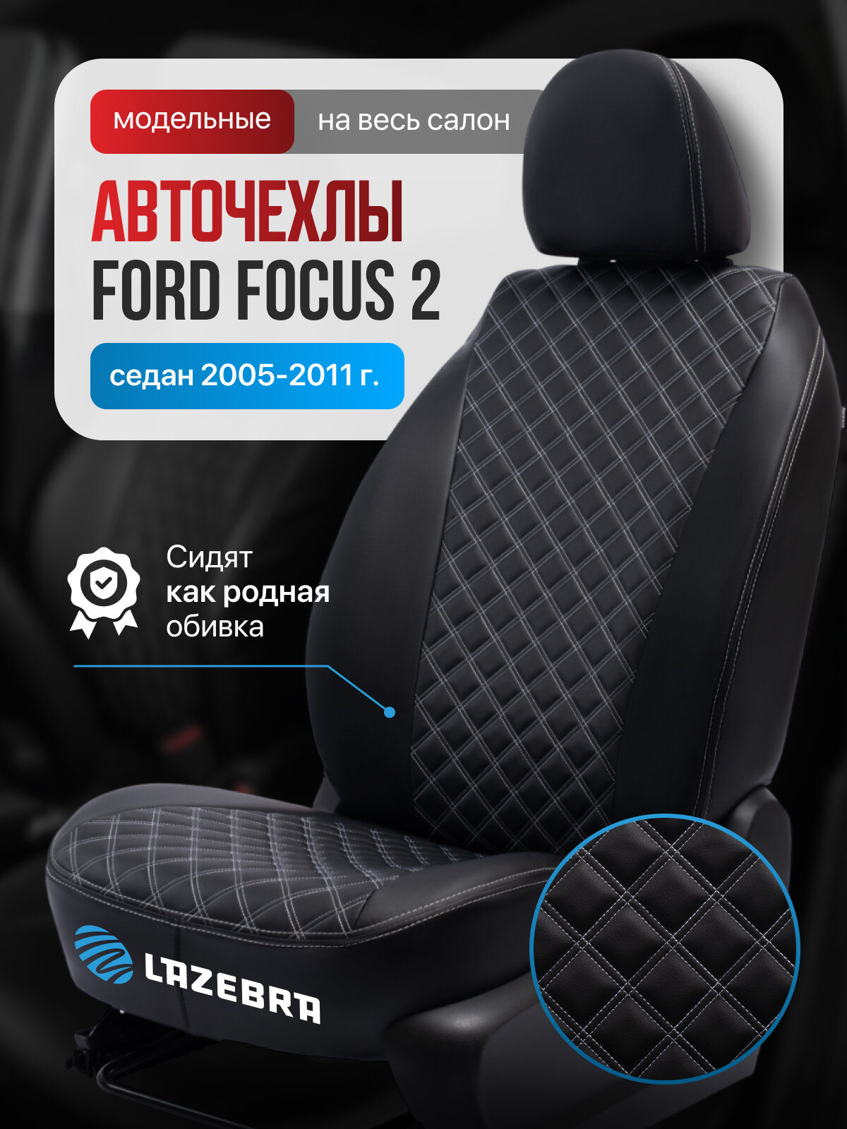 Авточехлы Российского бренда Lazebra - комплект на весь салон Ford Focus 2 - комплект отшивается по индивидуальным лекалам для конкретного авто, поэтому идеально подойдет для Ford Focus 2 2005 - 2011г. выпуска с типом кузова - Trend/Ambiente седан, хэтчбек 5 дверей, универсал. Обращаем внимание владельцев Ford Focus Сhia с задним подлокотником и центральным ремнем безопасности - данные чехлы НЕ подойдут для этой модели. Чехлы для автомобильных сидений форд фокус 2 оснащены раздельной задней спинкой 60/40, тип заднего сидения 60/40. Авто чехлы в машину выполнены из приятной премиальной экокожи высокого качества толщиной 0,8 мм. Материал триплирован поролоном 2 мм, чехол поэтому приобретает дополнительную мягкость. Обратите внимание!- НЕ предусмотрены отверстия под подголовники. Мы специально не делаем отверстий, для того, чтобы чехлы выглядели наиболее привлекательно. Их сделать легко: этот процесс есть в инструкции по установке.