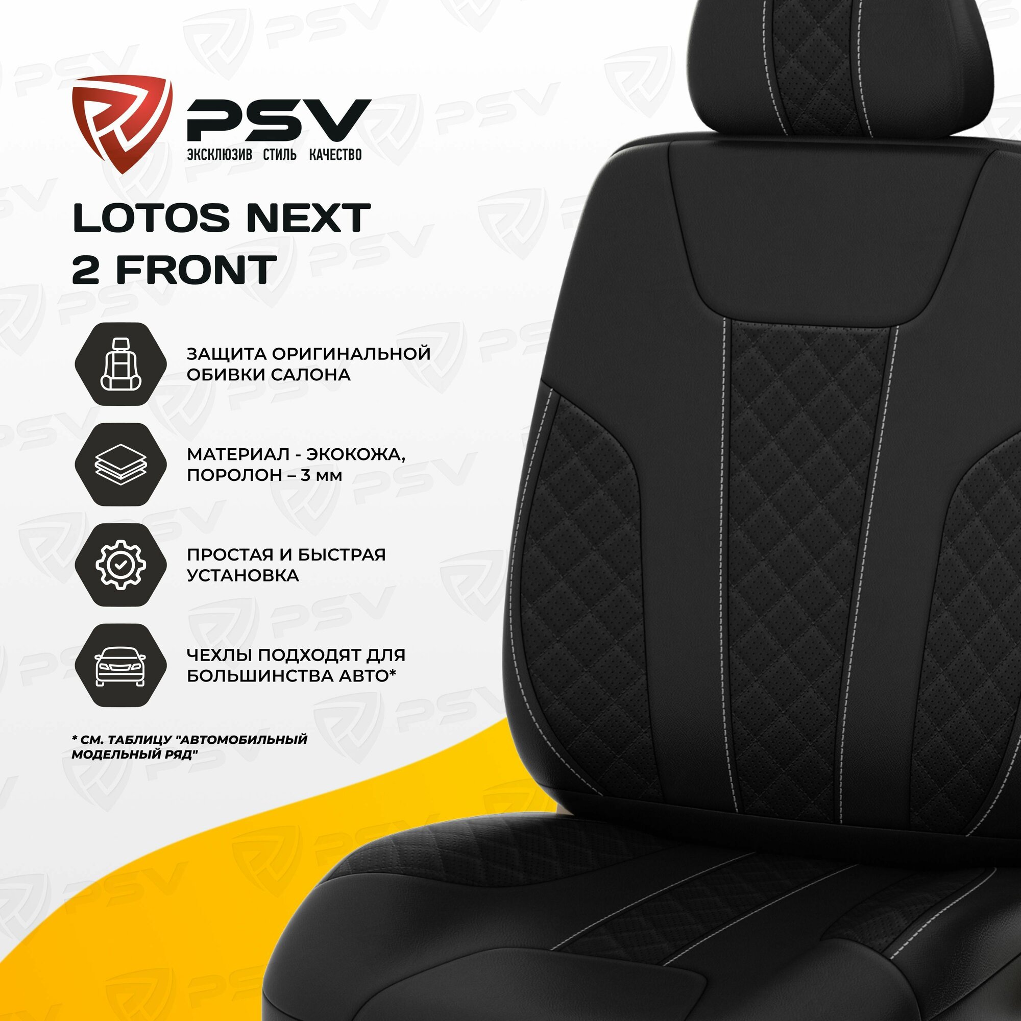 Чехлы на сиденья автомобильные в машину на передние сиденья универсальные PSV Lotos Next 2 FRONT (Черный/отстрочка белая), экокожа: сравнение цен, характеристики, фото, актуальное наличие и цены.
