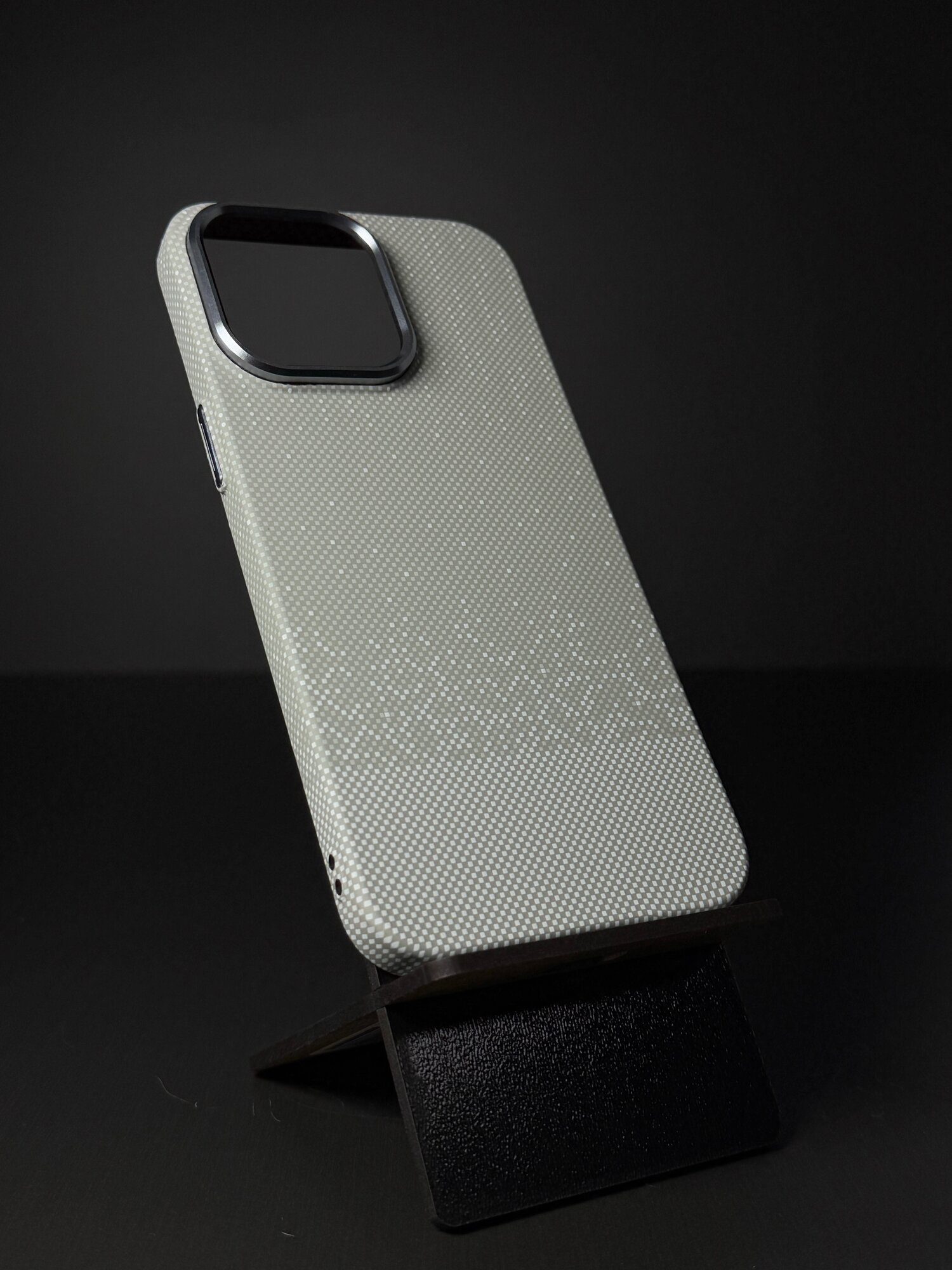 Тонкий и прочный чехол под карбон, со вставками под металл, с отдельными кнопками включение и регулировки громкости.