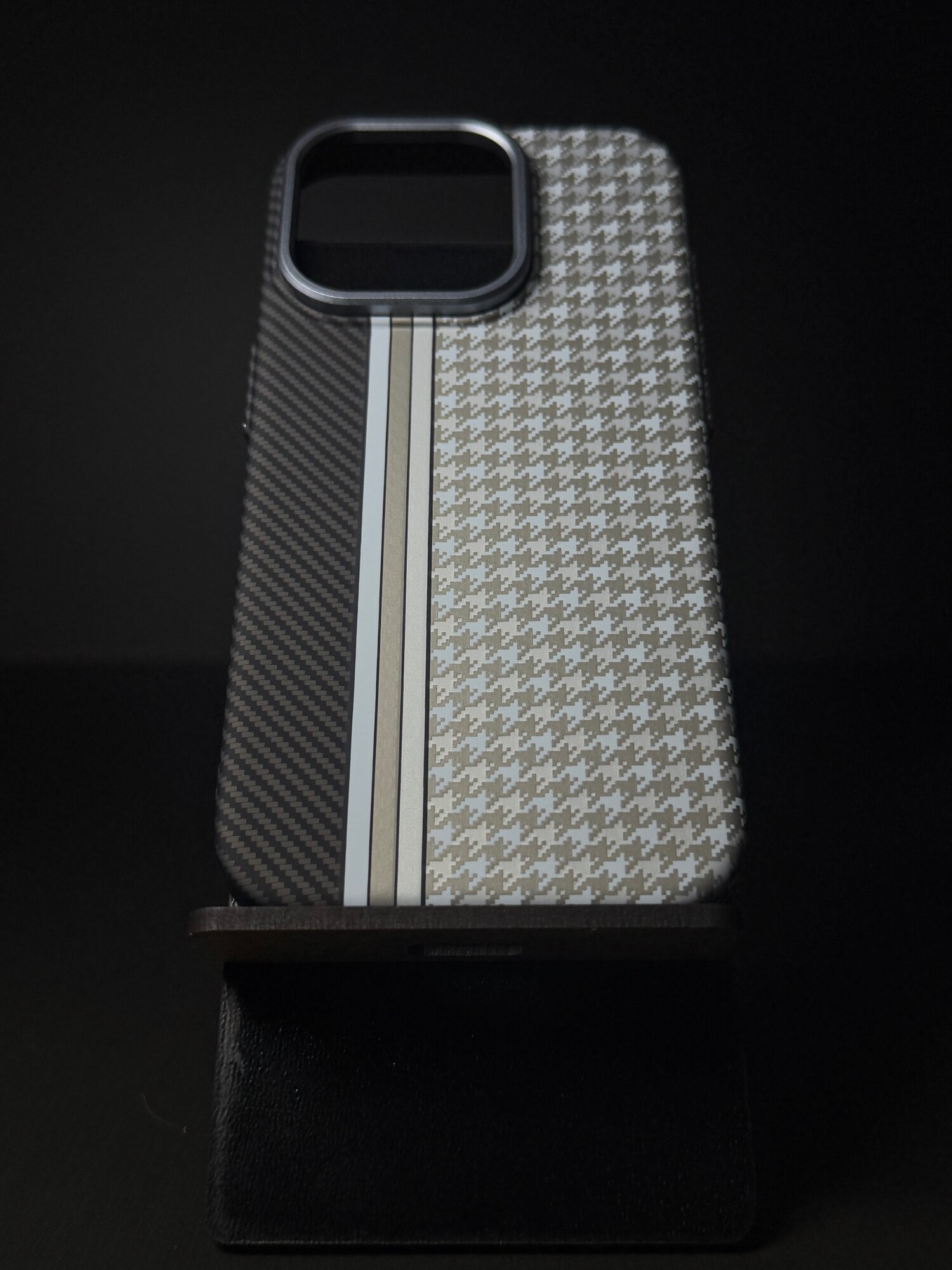 Тонкий и прочный чехол под карбон, со вставками под металл, с отдельными кнопками включение и регулировки громкости.