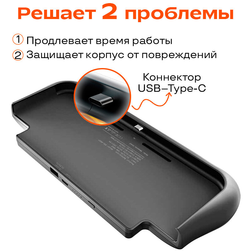 Особенности чехла-аккумулятора InnoZone Решает две проблемы Чехол-аккумулятор InnoZone – это аксессуар для Nintendo Switch, который решает сразу две головные боли: продлевает время работы игровой консоли и защищает ее корпус от повреждений. Стильный дизайн, тонкий корпус и приятная на ощупь поверхность – первое, что бросается в глаза. Выглядит он как обычный чехол-накладка, но внутри него спрятан встроенный коннектор USB Type-C. Защищает и не мешает Чехол закрывает заднюю крышку и торцы Switch вместе с надетыми контроллерами Joy-Con. Он совершенно не мешает полноценно пользоваться игровой консолью и отлично защищает ее от повреждений при случайных незначительных ударах. Настольная подставка На задней стороне чехла спрятана откидная подставка, которая позволяет ставить игровую консоль на горизонтальную поверхность под удобным для просмотра углом. В сложенном виде она ни за что не цепляется и не мешает комфортному использованию гаджета. Под откидной поставкой сделан отсек для хранения карт памяти. На 140% больше энергии Емкость аккумулятора чехла InnoZone составляет 10000 мАч. Это дает игровой консоли дополнительно 140% заряда. Такой запас поможет вам значительно продлить свое игровое время. Простой в использовании Чтобы начать зарядку, надо вставить Nintendo Switch внутрь и нажать кнопку на торцевой стороне чехла. Вам не понадобится ничего настраивать и устанавливать. Кроме того, от этого чехла-аккумулятора можно заряжать и другие мобильные устройства. Для этого на торцевой части расположен USB выход. Показывает текущий уровень заряда Рядом с кнопкой питания находятся четыре светодиода. После нажатия на кнопку они загораются белым цветом. По их количеству вы сможете оценить, сколько энергии осталось в чехле. Одна лампочка соответствует 25% и менее. Технические характеристики чехла-аккумулятора InnoZone Входное напряжение: 5, 9 В Входная мощность: 18 Вт (max) Выходные напряжение/ток: 5 В/3 А, 9 В/2 А, 12 В/1.5 А Тип аккумулятора: литиевый Емкость аккумулятора: 10000 мАч Материалы: ABS-пластик, PC-поликарбонат Совместимые модели: Nintendo Switch Nintendo Switch OLED Размеры: 265.8x112.1x38 мм Вес: 377 г