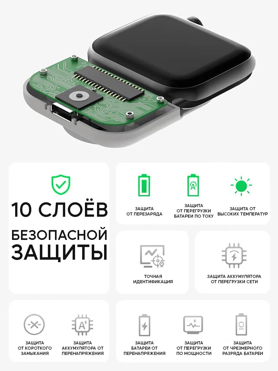 Оставайтесь на связи и будьте активны без ограничений! Этот стильный и эксклюзивный чехол с функцией аккумулятора создан для смарт-часов Apple Watch, чтобы продлить время их работы и обеспечить надежную защиту. Основные преимущества: зарядка Type-C — удобный и современный разъём для быстрой зарядки; ёмкость аккумулятора 1200 мАч — достаточно энергии для подзарядки ваших эппл вотч в течение дня; световой индикатор — позволяет отслеживать уровень заряда аккумулятора и всегда быть готовым к непредвиденным обстоятельствам; быстрая зарядка — ускорено восстановит заряд ваших часов без вреда устройству; умная система термостатирования — контролирует температуру устройства для предотвращения перегрева. Безопасность всегда на первом месте, поэтому кейс для смарт-часов оснащён 10 слоями защиты: защитой от перезарядки, перегрузки сети, скачков напряжения, чрезмерной разрядки батареи и др. Надежная защита в том, что это не просто повербанк для часов Apple Watch, но и прочный чехол, который оберегает ваш любимый аксессуар от царапин, пыли и повреждений. Элегантное исполнение, дизайн подходит к любому стилю и образу одежды, сохраняет минимализм Apple Watch. Лёгкость и компактность чехла с аккумулятором, удобно для повседневного использования, путешествий и тренировок. С чехлом-повербанком iWatch вы забудете о необходимости искать зарядное устройство! Отличный аксессуар для тех, кто ценит комфорт, стиль, надежность и современные технологии. Совместим с Apple Watch 7, Apple Watch Series 8, Apple Watch Series 9 и Apple Watch Series 10, размер дисплея 44 мм, 45 мм и 46 мм.