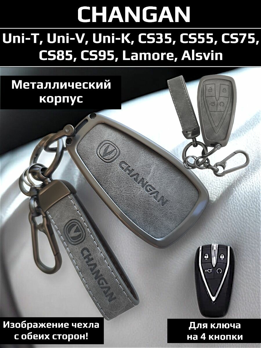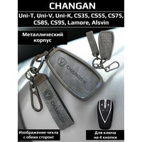 Чехол футляр для ключей к автoмобилям Changan Uni-T, Uni-V, Uni-K, CS35 Plus, CS55 Plus, CS75 Plus, CS85 Plus, CS95 Plus, Lamore и другие модели изготовлен из цинкового сплава с стильным темно-серым покрытием и вкладок из искусственной кожи. Для ключа С 4 кнопками!