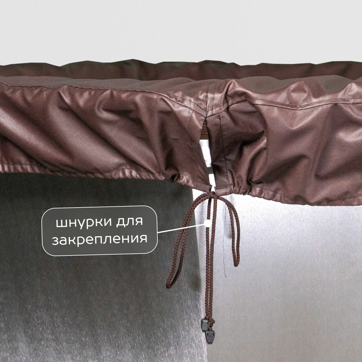 Чехол сделан из качественного материала и прошит двойными строчками высокопрочными лавсановыми нитками, устойчивыми к влаге и колебаниям температур. Завязывается чехол на прочные завязки снизу.