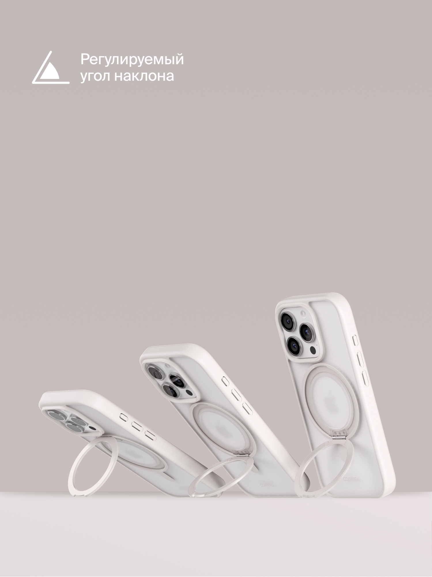 Алюминиевое кольцо с магнитами закреплено с помощью специального шарнира — прочного и надёжного. Чехол плотно магнитится и выдерживает вес телефона в любом положении: и вертикальном, и горизонтальном. Кольцо не царапается, у него удобная форма, которую приятно держать (и даже крутить — как фиджет) в руках.