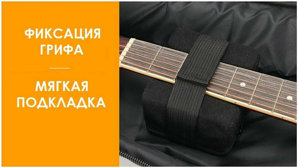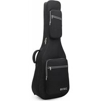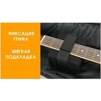 Мягкий утепленный чехол BRO BAG из плотного водоотталкивающего материала. Подойдет для классической или акустической гитары (в том числе эстрадной, дредноут), а также для большинства электрогитар (Стратокастер, Телекастер, Лэс Пол) размером до 106 см. Особенности: * Водоотталкивающий материал плотностью 600D * 4 внешних кармана для тетрадей и аксессуаров * Мягкая съемная подушка под гитарный гриф * Утеплитель толщиной 14мм * Регулируемые плечевые ремни * Мягкая ручка для удобной переноски * Светоотражающие полосы для безопасности в темное время суток * Резиновая пятка на дне для защиты от грязи * Вышитый логотип * Цвет: черный * Внешние размеры (см): 108(В)*43(Ш)*17(Г) * Вес: 1200г.