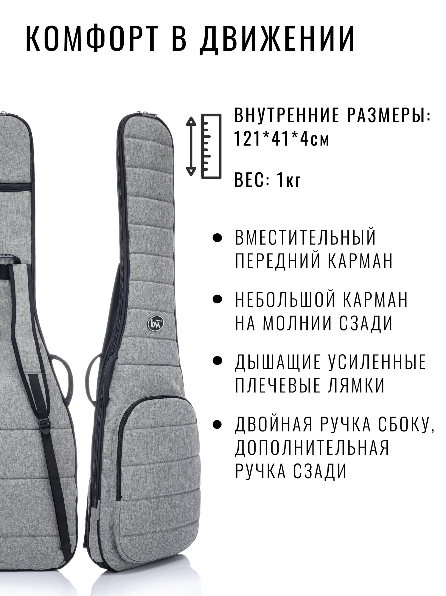 Стильный чехол bm для хранения и переноски бас-гитары наиболее популярных форм. Отличается большим наружным карманом. Дизайн, эргономика, набор удобных функций, оптимальные размеры чехла от bagandmusic без проблем позволят музыканту добраться до концертной площадки, школы, репетиционной базы. Музыкальный инструмент будет надёжно защищен от механических воздействий, от дождя (с функцией водонепроницаемого чехла в кратковременный дождь) и перепадов температуры. Внутренние размеры: высота 121х41х4 см. Параметры: Внутренний утеплитель поролон 12 мм, большой внешний карман на молнии, комфортные, широкие плечевые лямки ремни, двойную ручку сбоку, небольшую ручку вверху чехла, держатель грифа на липучке, подкладку из пены 20мм (защищающую дно, амортизирующая столкновения гитары с поверхностями) и усиленную молнию застежку. Между карманом и гитарой сделана дополнительная защита из пены. НЕ кейс для гитары. В ассортименте имеются чехлы BAG&music для гитары акустической, гитары классической, акустической и электро- гитары и другого музыкального оборудования, рюкзаки. Отличный подарок гитаристу на 23 февраля!