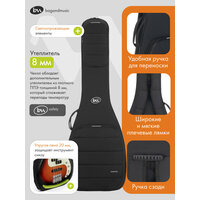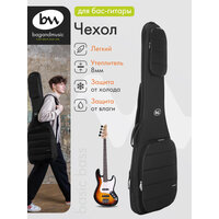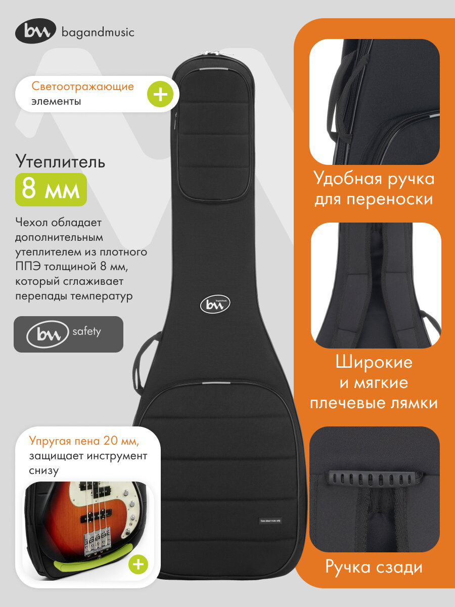 Утепленный чехол bagandmusic Basic для бас-гитар наиболее популярных форм. Обеспечит надежную защиту вашего инструмента от дождя и мороза благодаря специально разработанной водостойкой ткани. Он обладает усиленным дном, которое защитит гитару от ударов и повреждений. Чехол обладает дополнительным утеплителем из плотного ППЭ толщиной 8 мм, который предотвратит перепады температур. Внутренние размеры чехла: 121х38х4см. Чехол bm также оснащен широкими и мягкими плечевыми лямками, которые позволят комфортно носить его как рюкзак и имеет несколько ручек для переноски чехла как в вертикальном, так и в горизонтальном положении. Чехол оснащен долговечными молниями, которые отлично работают и прослужат вам долгое время. Два накладных удобных кармана на фасаде чехла позволят вам хранить дополнительные аксессуары - такие как струны, медиаторы, тюнеры, ремни или небольшие звукосниматели. Нижний карман подойдет для ноутбука или 2-3х педалей. Вы всегда сможете иметь при себе необходимые мелочи, не перегружая сумку. Светоотражающие элементы на чехле увеличивают вашу безопасность. Чехол BAG&music для электрогитары - идеальное решение для всех музыкантов, которые ценят свой инструмент и хотят обеспечить ему надежную защиту. Также он станет отличным подарком на День рождения, 23 февраля или любой другой праздник.