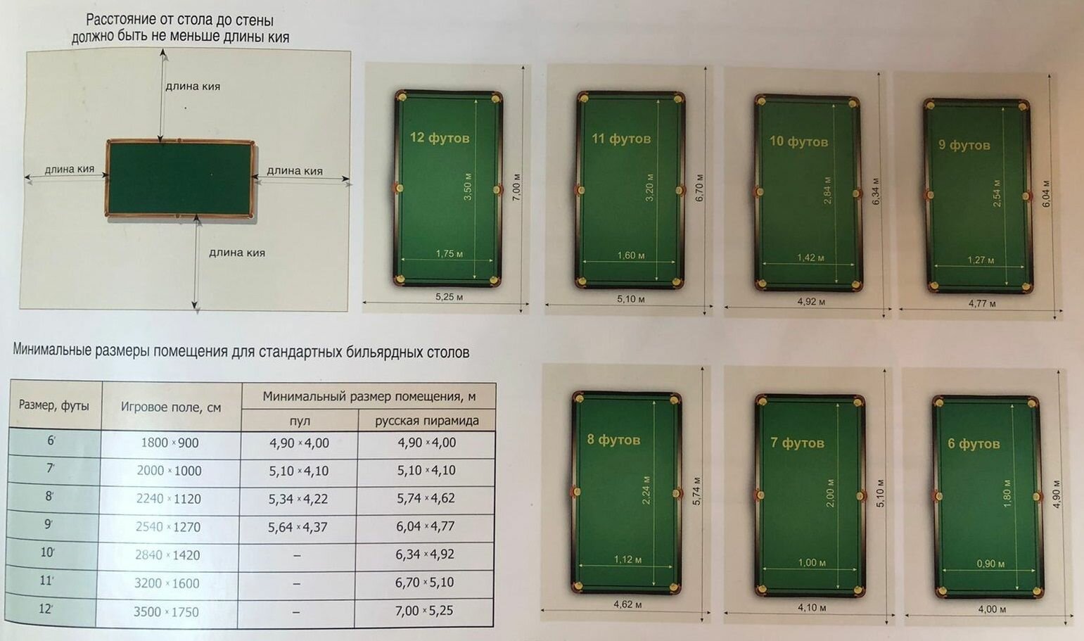 Чтобы правильно определить размер своего бильярдного стола, сверьте размер своего игрового поля с таблицей ниже.