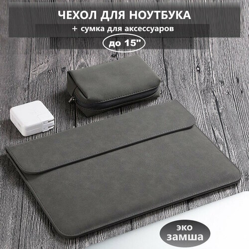 Стильный и удобный, сверхтонкий чехол-папка на магнитных замках для ноутбука до 15 дюймов из качественной эко-замши, в комплекте с сумочкой для зарядного устройства, мышки и др. аксессуаров.