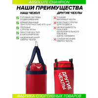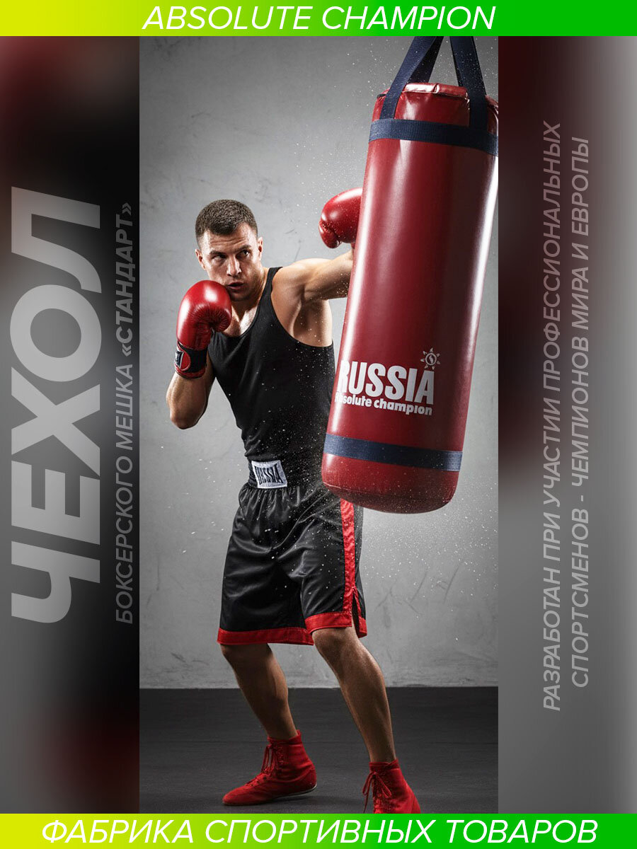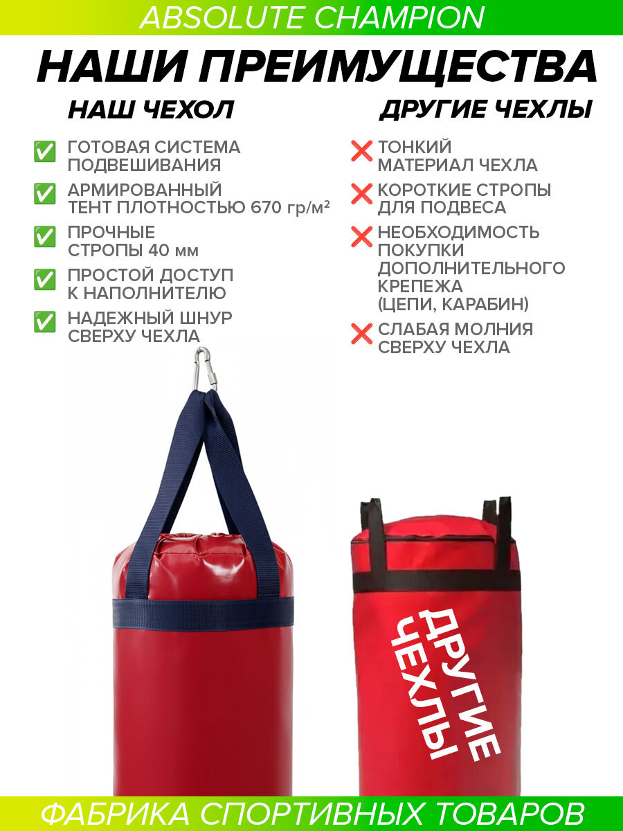 Чехол груши для бокса изготовлен специально для Вас и заряжен успехом чемпионов Мира! Мешок для бокса разработан при участии профессионального боксера и чемпиона Мира Андрея Сироткина и изготовлен фабрикой спорт товаров Absolute Champion! Чехол Груши для бокса имеет отличную форму и изготовлена из прочного тента плотностью 650 г/м2. Чехол для груши состоит из самого чехла, стропы и карабина (системы крепления). Без наполнителя! Наш чехол для груши прослужит Вам долго, вы можете быть уверены в качестве продукции на 100%. Набить чехол Вы можете самостоятельно, наполнитель сухой песок или опилки, на Ваше усмотрение. Подвесная система мешка состоит из стропы и карабина. Внутри между чехлом и наполнителем рекомендуем прокладывать изофлекс, что улучшит качество и внешний вид груши. Рекомендации по набивке и этапы как правильно набить мешок, Вы найдете в инструкции, которой укомплектован каждый чехол, инструкция также размещена в самой карточке товара. Обращаем внимание, что при набивке использовать острые предметы запрещено, во избежание повреждения самого чехла. Мешок можно повесить на шведскую стенку, детский комплекс, на турник, или специальную навесную систему, кронштейн. Каждый чехол для груши надежно упакован в плотный пакет с многократной системой открывания, что защищает его при транспортировке. Рекомендуется наносить удары в защитной экипировке (защите). В нашем ассортименте представлена широкая линейка различных боксерских мешков, как для детей и подростков, так и для взрослых. Вы можете приобрести чехол, а можете купить уже готовую боксерскую грушу, которая уже набита до нужного веса. Есть груши с подвесной системой стропа и карабин, а есть с цепями и карабин, также представлена широкая цветовая гамма и различные веса 15, 22, 20, 25, 30, 35, 40, 60, 50, 65 кг. Качество соответствует мировым стандартам. Наполнитель (набивка) – это сухой песок и мелкие опилки. Вы можете также приобрести у нас и другие спортивные товары и различный инвентарь от производителя: кронштейны для мешков, турники настенные, турник 3 в 1, турник брусья 3в1, шведские стенки, турник наддверный (крепежи), хайлетсы, эспандеры, детские тарзанки и качели для детей, мягкие ледянки, ролик для пресса, товары для детей и многое другое. Переходите на наш магазин Absolute Champion и выбирайте товары для себя и в подарок (подарочные наборы на день рожденье) для мамы (женские), мужа, бабушки, мальчика, девочки или папы. Для Вас проводим различные акции. На всю нашу продукцию гарантия от надежного российского производителя с 25 летним опытом работы 1 год. Отличный подарок для каждого, на любой праздник, это практично и такой подарок будет всегда полезен для здоровья, не ждите повода, сделайте подарок себе или своим близким уже сегодня и на Новый год! Покупайте продукцию от фабрики спорт товаров Absolute Champion и получайте товары, заряженные энергией успеха Чемпионов Мира!