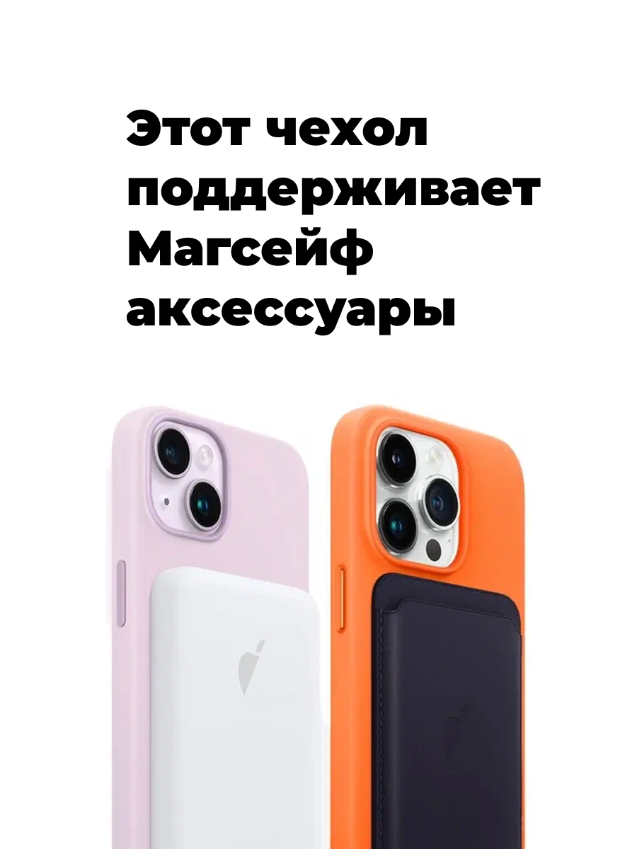 Аксессуар выполнен из прочного поликарбоната – это лёгкий и гибкий материал, который полностью прилегает ко всем изгибам смартфона и защищает его от различных мелких повреждений, пыли и царапин. Клип-кейс совместим с беспроводной зарядкой Магсейф – просто поместите устройство на поверхность чехла, и оно тут же примагнититься к нему. Вы сможете пользоваться смартфоном как обычно, пока его батарея будет заряжаться.