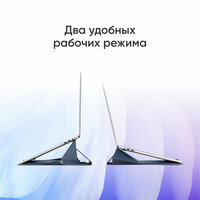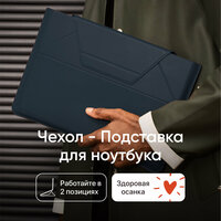 Чехол для ноутбука трансформируется до подставки. Визуально выглядит как папка, закрывается на кнопку и защищает ноутбук от царапин и повреждений. Конструкция подставки выдерживает нагрузку до 10 килограмм. Модель совместима с ноутбуками с диагональю 13,3 дюймов, а также 14 дюймов. Размеры ноутбука: не более 30,5 х 21,5 х 1,7 см. Размер чехла: 34 х 24 х 0,7 см. Вес: 285 г.