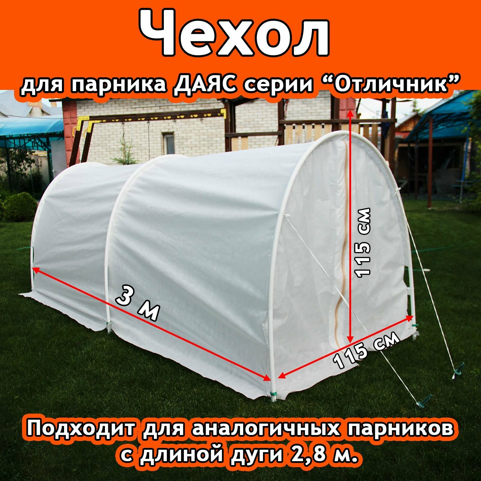 1) Чехол сшит из укрывного материала марки Райфенхаузер SSS-60. Материал Райфенхаузер производится по специальной рецептуре по техническому заданию производителя «Даяс». Благодаря современным технологиям и особой рецептуре данный материал существенно отличается от обычных укрывных материалов серии «Агро». Отличий и нюансов много, но самое важное для садоводов — это более долгий срок службы и то, что под этим материалом автоматически формируется наиболее благоприятный микроклимат для развития растений.