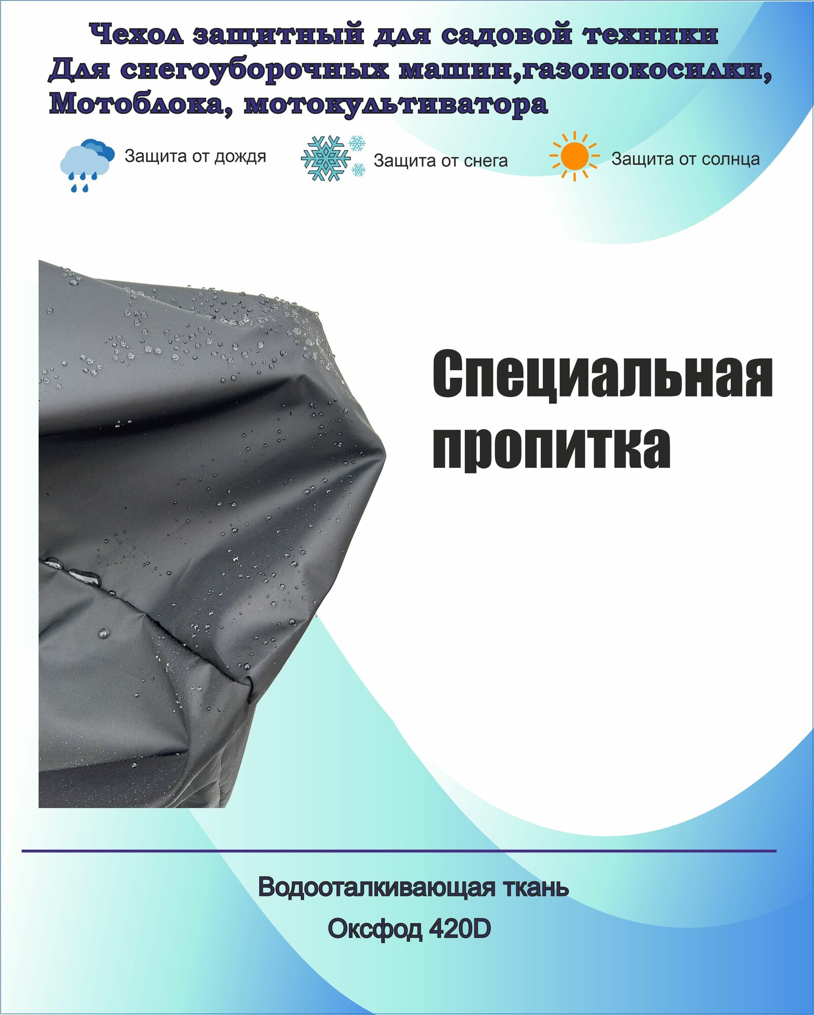 Чехол подходит не только для снегоуборщиков и отбрасывателей снега, но и для райдеров, газонокосилок, мотоблоков, культиваторов, мотобуксировщиков и других устройств. За изделием легко ухаживать: его можно стирать и оно быстро сохнет. Для производства чехла используется ткань оксфорд 420 Д с грязе- и водоотталкивающими свойствами. Ткань очень практичная и плотная.