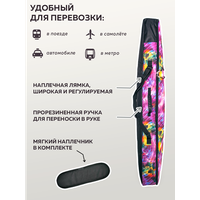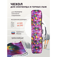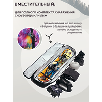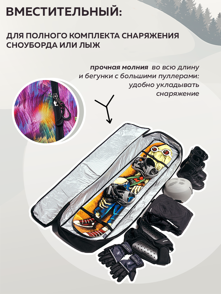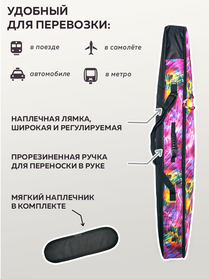 Чехол для сноуборда от бренда Nordic - это один из незаменимых аксессуаров для лыжника и сноубордиста, которые хотят чтобы их снаряжение всегда оставалось в отличном состоянии во время путешествий на зимний горнолыжный курорт. Трехслойная сумка - переноска без колес выполнена из крепкой ткани Оксфорд 600 den PVC с водоотталкивающей пропиткой, которая во время зимы устойчива к снегу и воде, дождю и грязи. Безопасный пенополиэтилен, составляющий противоударный защитный слой, необходим для оптимальной амортизации снаряжения и его защиты от ударов. Внутренний слой из тарпаулина создает водонепроницаемый и непромокаемый эффект. Внутри прочный сноубордический чехол имеет две регулируемые стяжки и фиксаторы (фастексы), расположенные по краям, чтобы в момент поездки или перелете на самолете комплект горных лыж или доска для катания были надежно зафиксированы. Большой размер 35*13 вмещает в себя полный набор экипировки горнолыжника и сноубордиста. Будь то крепления и ботинки, шлем и маска, перчатки и лыжные палки, а так же другие необходимые вещи и аксессуары - экипировка быстро и легко поместится внутри переноски. Спортивный походный чехол для сноуборда может быть использован как взрослый (мужской или женский) или детский за счет своей уникальной длины на 145 или 155, 165 или 175 см, 190 см. Туристический чехол идеально подойдет для перевозки в машину и самолет. Разнообразный яркий принт разработан специально для любителей зимних видов спорта. Длинный плотный чехол с рисунком оборудован прочной молнией во всю длину. Лямка на плечо для ходьбы на большие расстояния и прорезиненная ручка для переноски сумки для хранения в руке обеспечивают свободное и быстрое перемещение во время туризма. Мягкий наплечник для ремня включен в комплект. Теперь активный отдых и сноубординг в горах выйдут на новый уровень вместе с чехлом для сноуборда и лыж от бренда Нордик не только для взрослых, но и для детей.
