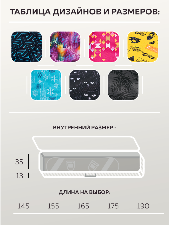 Чехол для сноуборда от бренда Nordic - это один из незаменимых аксессуаров для лыжника и сноубордиста, которые хотят чтобы их снаряжение всегда оставалось в отличном состоянии во время путешествий на зимний горнолыжный курорт. Трехслойная сумка - переноска без колес выполнена из крепкой ткани Оксфорд 600 den PVC с водоотталкивающей пропиткой, которая во время зимы устойчива к снегу и воде, дождю и грязи. Безопасный пенополиэтилен, составляющий противоударный защитный слой, необходим для оптимальной амортизации снаряжения и его защиты от ударов. Внутренний слой из тарпаулина создает водонепроницаемый и непромокаемый эффект. Внутри прочный сноубордический чехол имеет две регулируемые стяжки и фиксаторы (фастексы), расположенные по краям, чтобы в момент поездки или перелете на самолете комплект горных лыж или доска для катания были надежно зафиксированы. Большой размер 35*13 вмещает в себя полный набор экипировки горнолыжника и сноубордиста. Будь то крепления и ботинки, шлем и маска, перчатки и лыжные палки, а так же другие необходимые вещи и аксессуары - экипировка быстро и легко поместится внутри переноски. Спортивный походный чехол для сноуборда может быть использован как взрослый (мужской или женский) или детский за счет своей уникальной длины на 145 или 155, 165 или 175 см, 190 см. Туристический чехол идеально подойдет для перевозки в машину и самолет. Разнообразный яркий принт разработан специально для любителей зимних видов спорта. Длинный плотный чехол с рисунком оборудован прочной молнией во всю длину. Лямка на плечо для ходьбы на большие расстояния и прорезиненная ручка для переноски сумки для хранения в руке обеспечивают свободное и быстрое перемещение во время туризма. Мягкий наплечник для ремня включен в комплект. Теперь активный отдых и сноубординг в горах выйдут на новый уровень вместе с чехлом для сноуборда и лыж от бренда Нордик не только для взрослых, но и для детей.