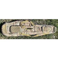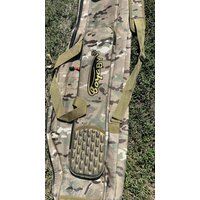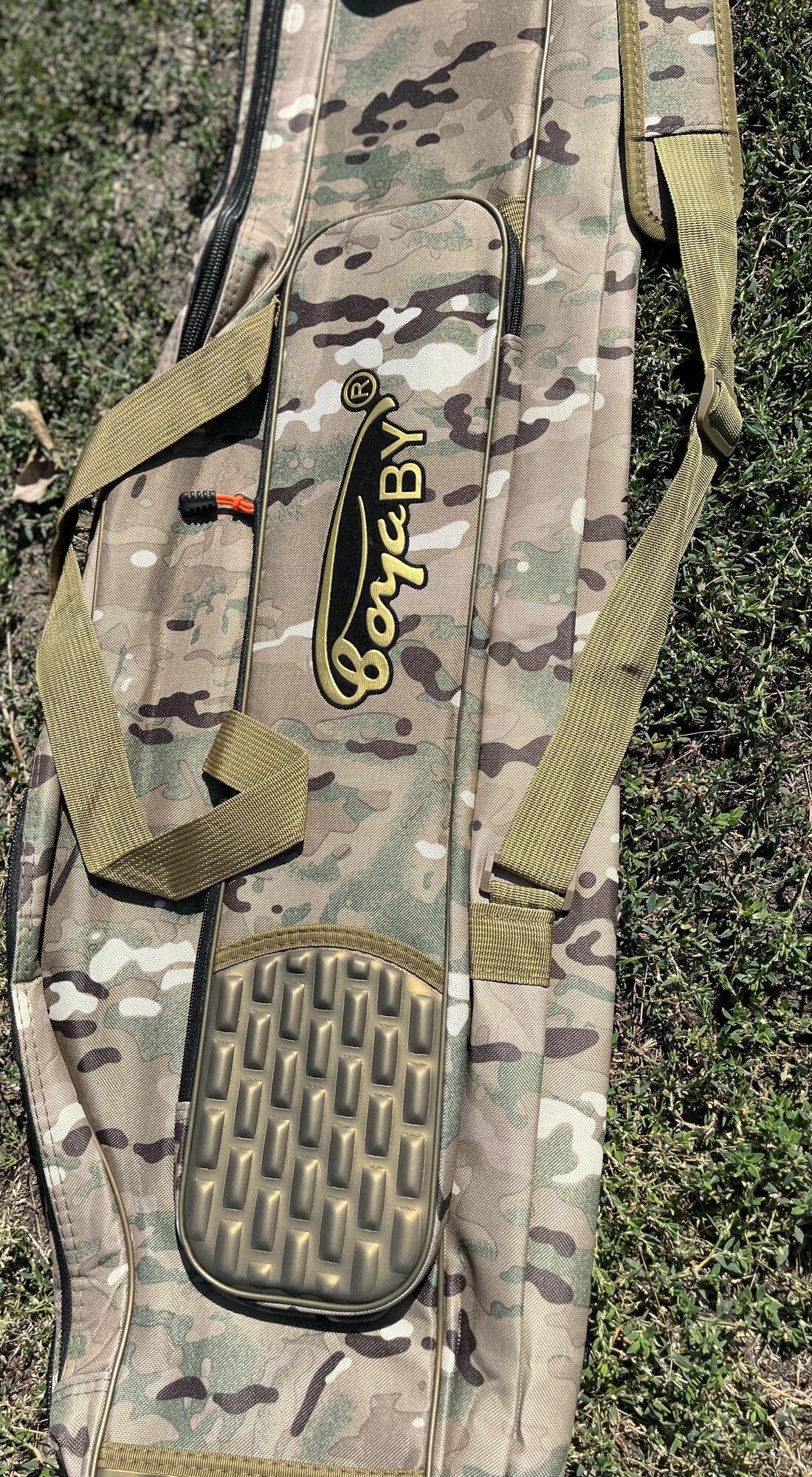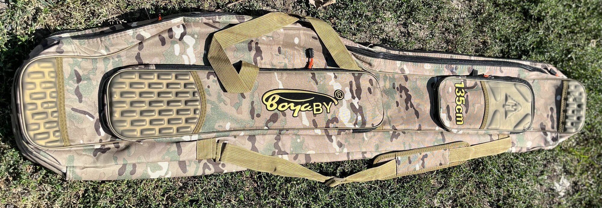 Чехол 3 отсека +2 наружных кармана. Материал плотный, для дополнительного укрепления по контурам усилен проволокой. Имеются ремни для удобства переноски. С задней стороны есть липучки и карман для установки подсака или дополнительных удочек