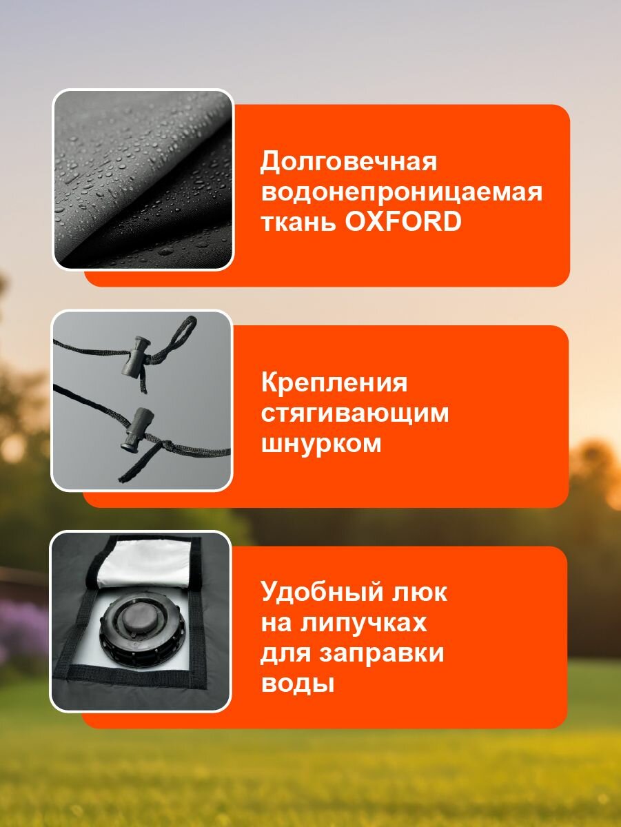 Чехол на куб для воды легко крепится с помощью шнура и имеет люк на липучках для удобного заполнения воды. Предусмотрена молния для контроля уровня воды и слива.