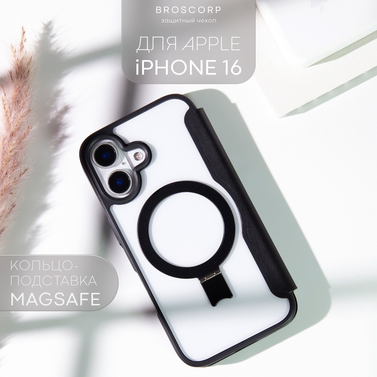 Купить Чехол-книжка Broscorp на Apple iPhone 16 (Айфон 16), премиальный с магнитным кольцом, черный с доставкой по всей России.
