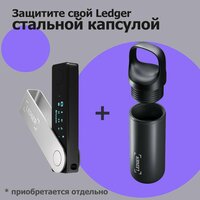 Легкая и прочная портативная капсула черного цвета для хранения криптокошелька Ledger Nano. Корпус аксессуара сделан из металла, пластика и силикона.
